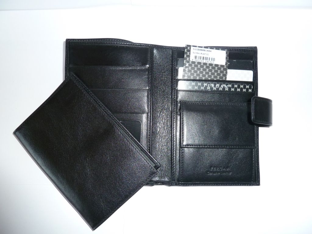 вертикальный кожаный бумажник выполнен из натуральной телячьей кожи, кожа гладкая, закрывается на кнопку, с кожаным вкладышем под паспорт внутри, который вытаскивется, бумажник имеет два отделения под купюры, карман на кнопке для монет, три кармашка для водительских прав, одно из которых с окошком из прозрачной сеточки, четыре кармашка под пластиковые карты.