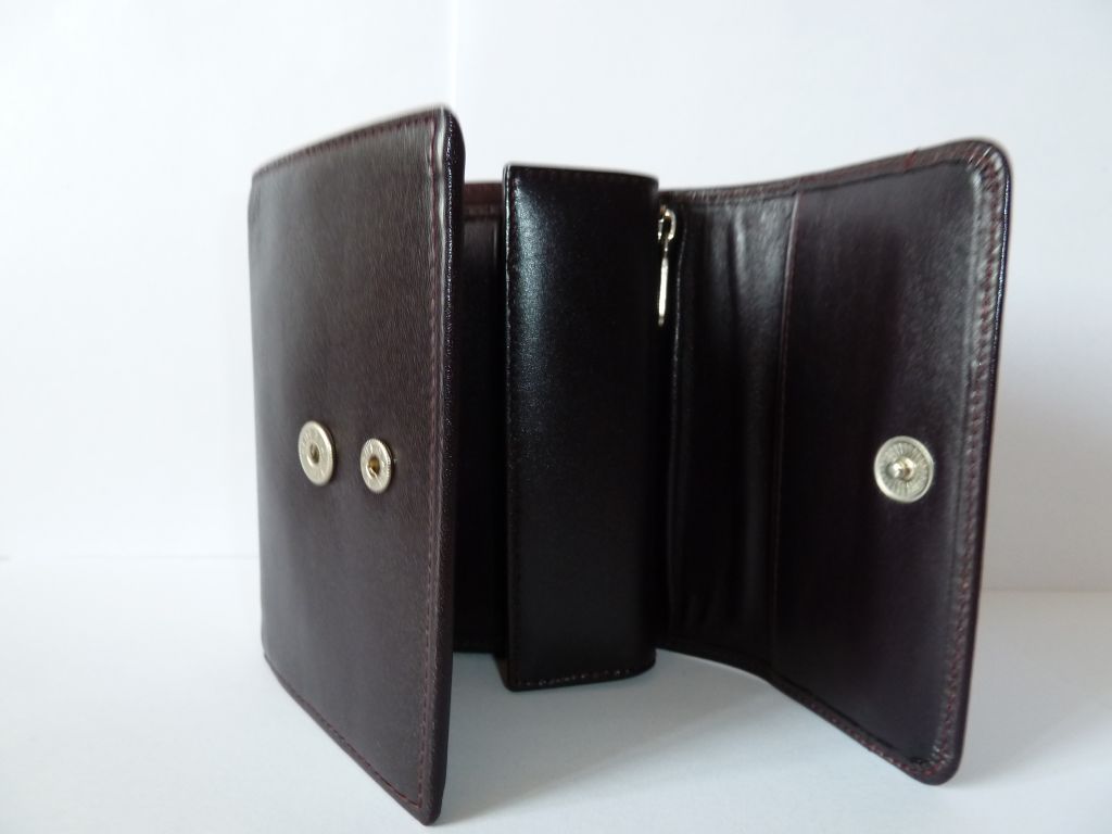 кошелек кожаный женский из матовой гладкой кожи в три сложения, внутри кошелька есть отделение для мелочи на молнии, для купюр одно отделение, шесть кармашков под пластиковые карты, два окошка с прозрачной сеткой, два боковых кармашка.