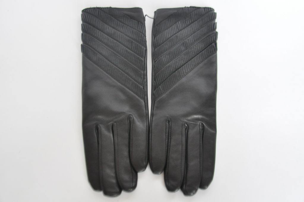 Вашему вниманию предлагается модель перчаток выполненная из натуральной кожи ягненка с подкладкой из натуральной шерсти. Расстояние от снования большого пальца до края перчатки равно 13 см. на задней стороне перчатки имеется разрез, который кожаным хлястиком застегивается на кнопку. Впереди перчатка декорирована кожаной бахромой "елочкой" в виде диагональных полос.