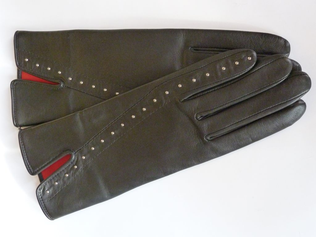 Данная модель перчаток выполнена из натуральной кожи ягненка на шелковой подкладке. Удлиненная модель, длина от основания большого пальца состовляет 12,5 см. С внешней стороны перчатки есть разрез для отварачивания манжеты. Внутренняя сторона манжеты выполнена из кожи красного цвета. С внешней стороны модель перчаток украшены очень маленькими металлическими клепками по диагонали от края перчатки до края пальца-мизинца.Край перчатка обработан кантом из кожи. Перчатка идеально сидит на руке.