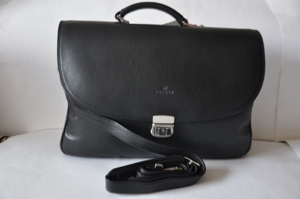 Портфель сделан из мягкой, матовой в мелкую паутинку кожи. Имеет мягкую форму. Закрывается на замок с ключиком. Состоит из двух широких отделений, внутри которых находятся отделение на молнии, карман для визиток, телефона, ручек. Под крышкой портфеля есть отделение на молнии. На задней стенке портфеля отделение на кнопке. В портфеле есть ремень на плечо.