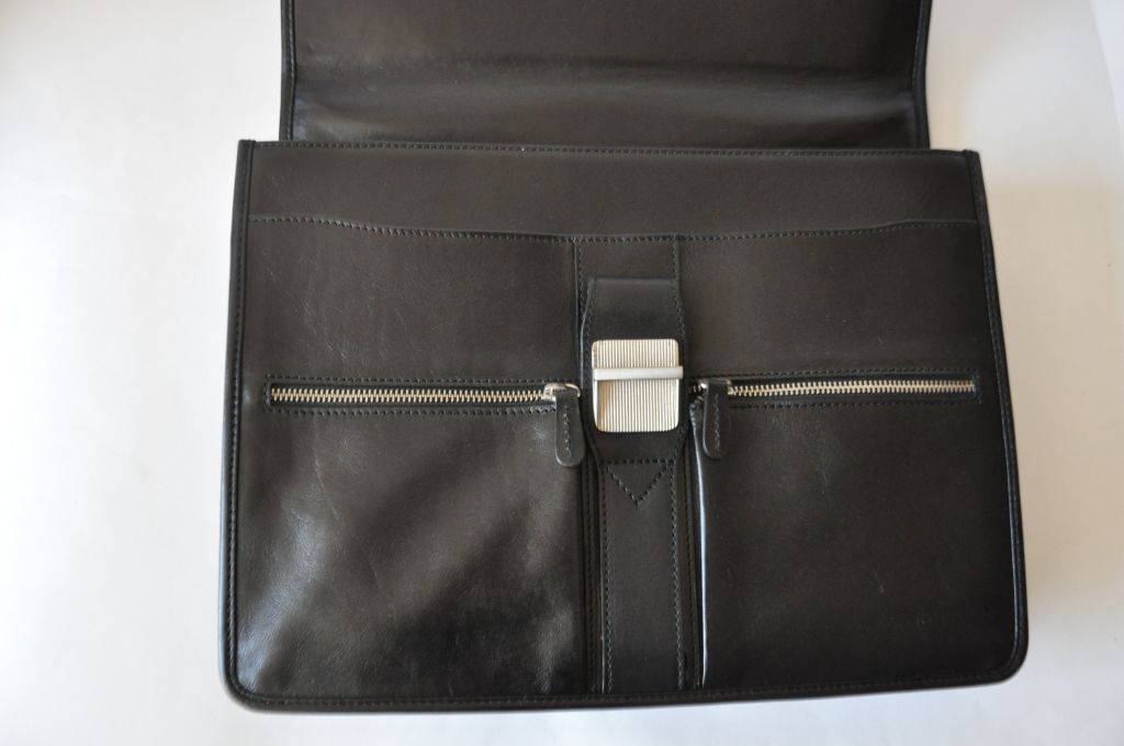 Портфель сделан из мягкой, гладкой кожи. Закрывается на кодовый замок. Имеет одно широкое отделение, внутри которого есть потайной карман на молнии, карманы для телефона, визиток, ручек. Снаружи портфеля имеется два накладных кармана на молнии, на задней стороне портфеля есть два отделения, одно из них закрывается на молнию, другое закрывается на внутреннюю кнопку с магнитом. В портфеле есть длинный ремень на плечо.