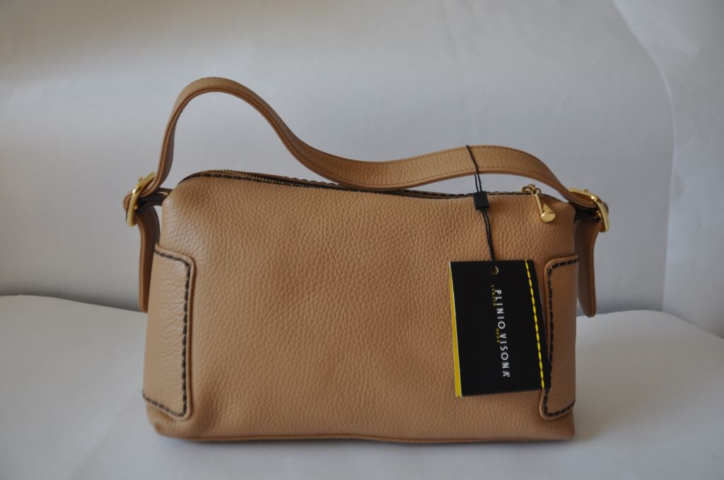 Сумка сделана из мягкой кожи «калифорния». Цвет сумки - светло-бежевый. Сумка имеет одно широкое отделение, которое застегивается на молнию. Внутри сумки находятся дополнительные карманы для документов, визиток, мобильного телефона. Сумка отделана с боковых сторон двумя накладными карманами, которые украшает крупная строчка из стежков коричневого цвета. Впереди на молнии есть кармашек. Фурнитура – из металла под золото («желтое золото»).